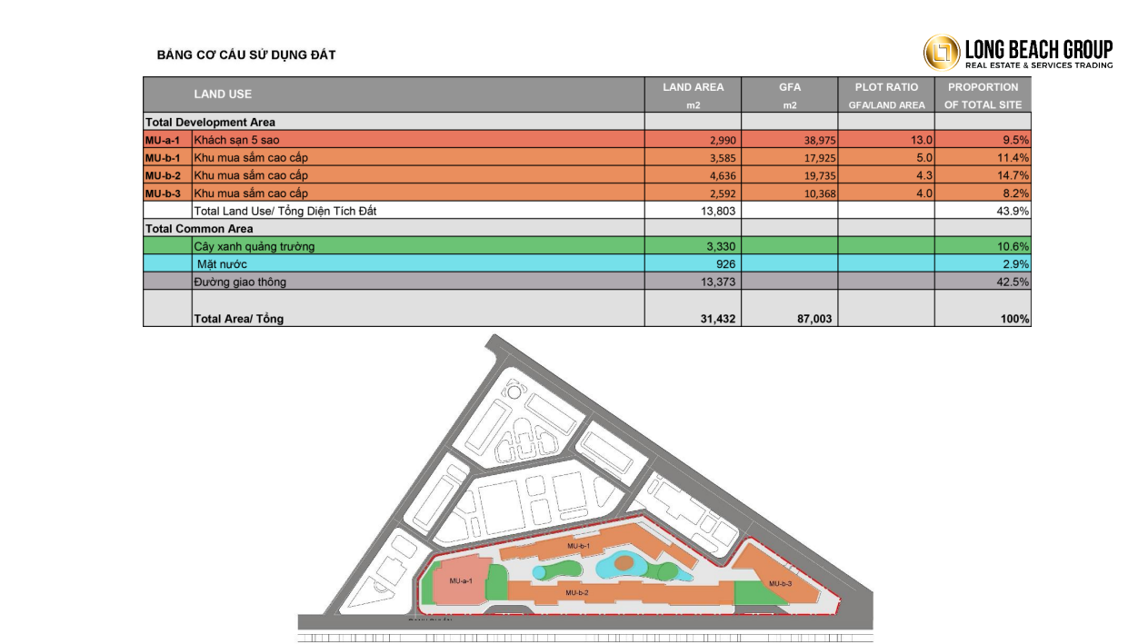 Tổng diện tích bao gồm cây xanh quảng trường, mặt nước, đường giao thông: 31.432 m2